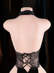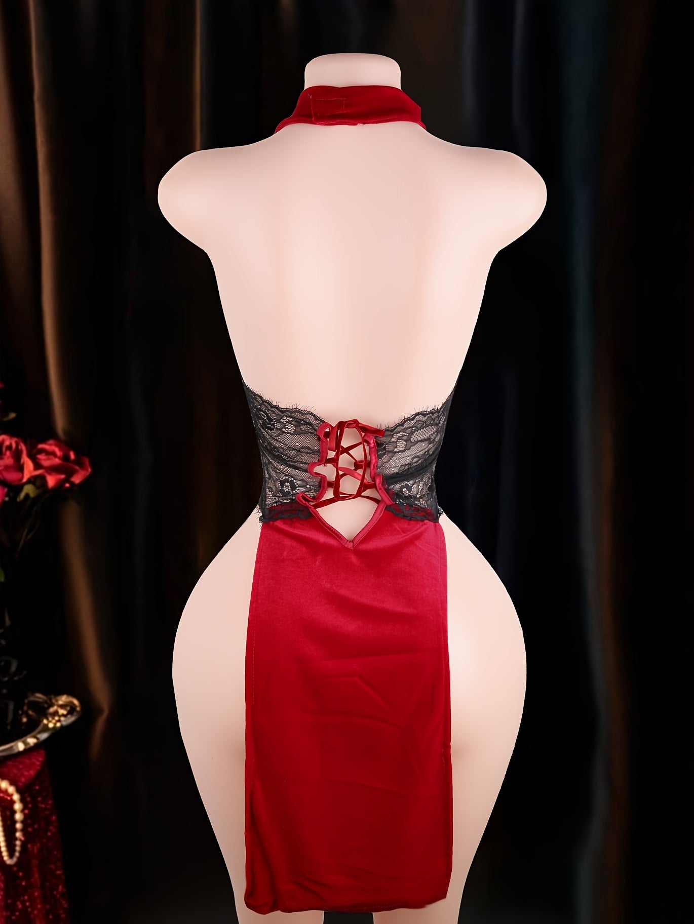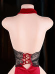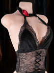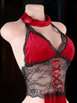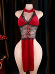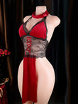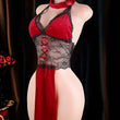 Crimson Veil est une élégante robe de lingerie qui associe un décolleté en V profond, une dentelle délicate et une silhouette fluide. La taille semi-transparente structure subtilement la silhouette, tandis que le laçage sur le devant, orné de bretelles croisées, apporte une touche de modernité.